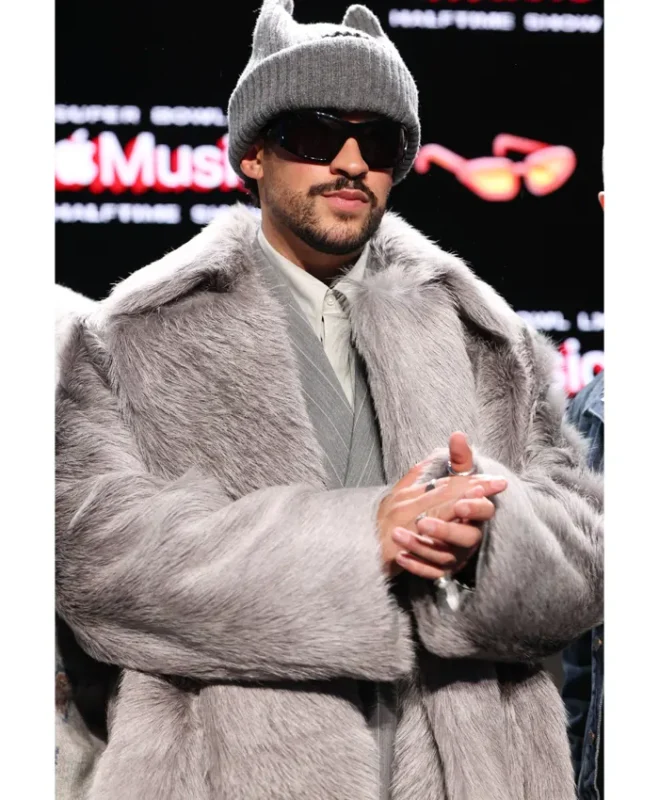 2026 Super Bowl LX Halftime Show Press Conference Bad Bunny Grey Shearling Coat