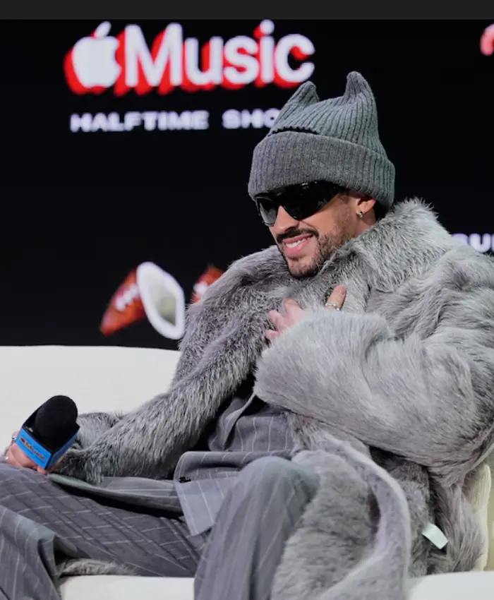 2026 Super Bowl LX Halftime Show Press Conference Bad Bunny Grey Shearling Coat