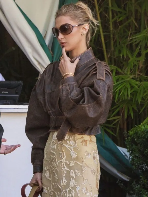 Street Style 2025 LA Bella Hadid Brown Cropped Distressed  Leather Jacket