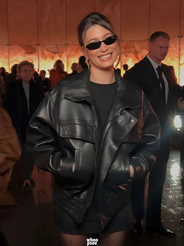 Hailey Bieber PFW 2025 Black Leather Jacket