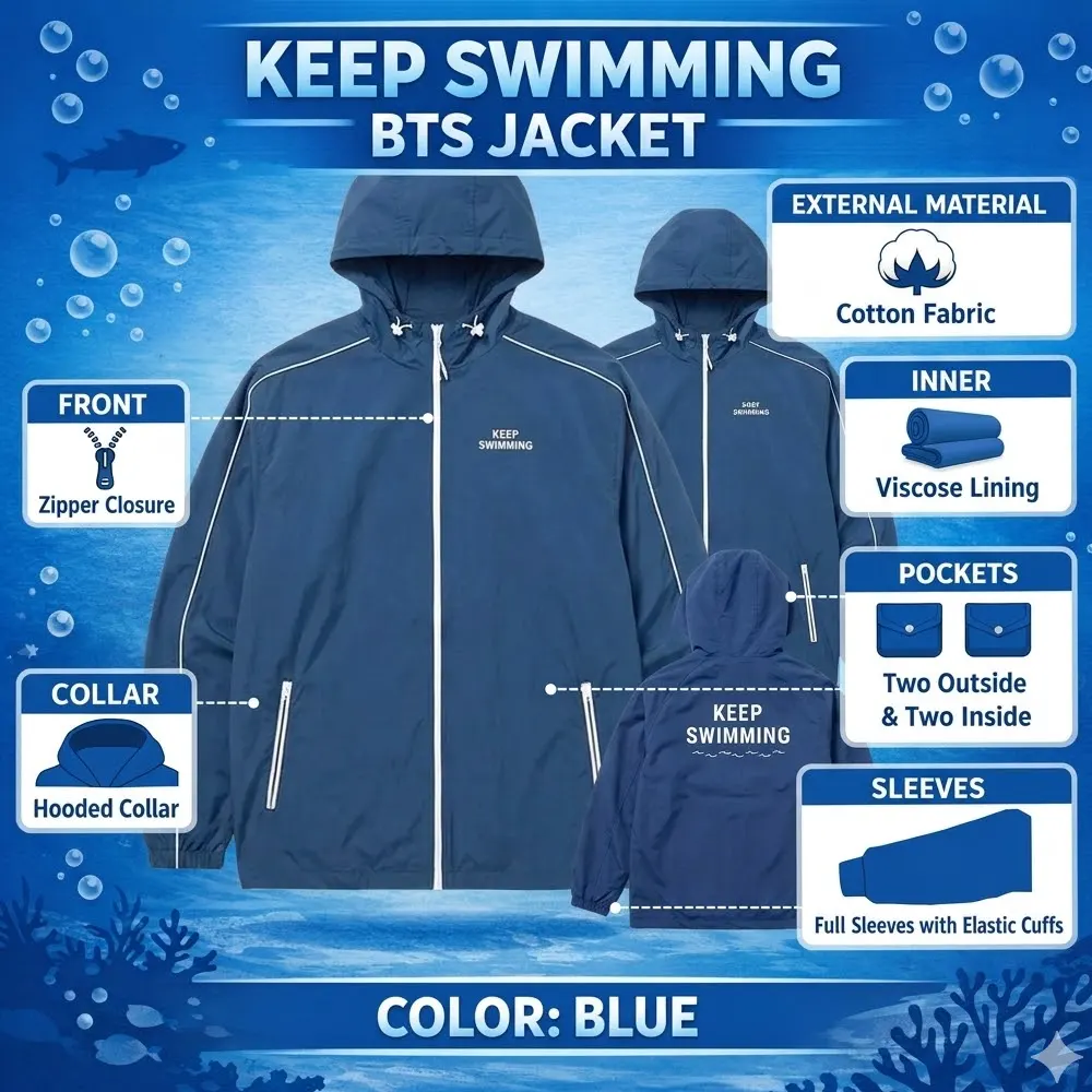 I recently bought the Keep Swimming BTS Jacket and I’m honestly impressed with the quality. The cotton fabric feels soft yet durable, and the inner viscose lining makes it super comfortable to wear all day. The blue color looks vibrant and exactly like the pictures online. As a BTS fan, this jacket really captures that iconic vibe. Definitely worth the purchase!