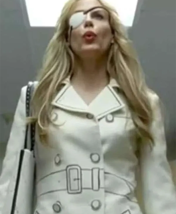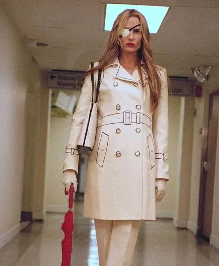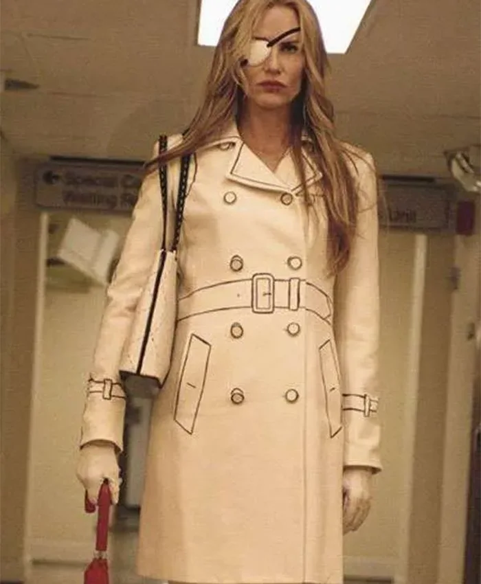 - Front: Doubl Breasted Buttoned and Belted Closure