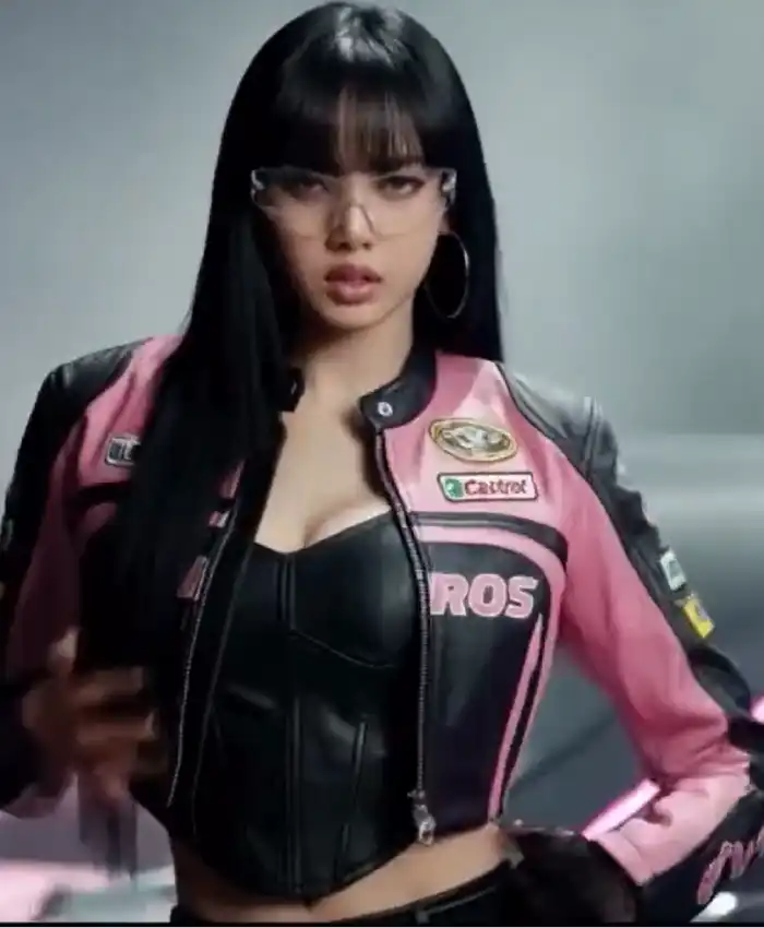 2026 BLACKPINK Lisa Pink and Black Leather Racing Jacket