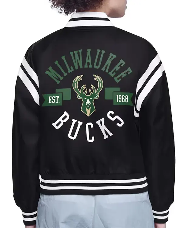 Milwaukee Bucks Printed Logo Black Varsity Satin Jacket