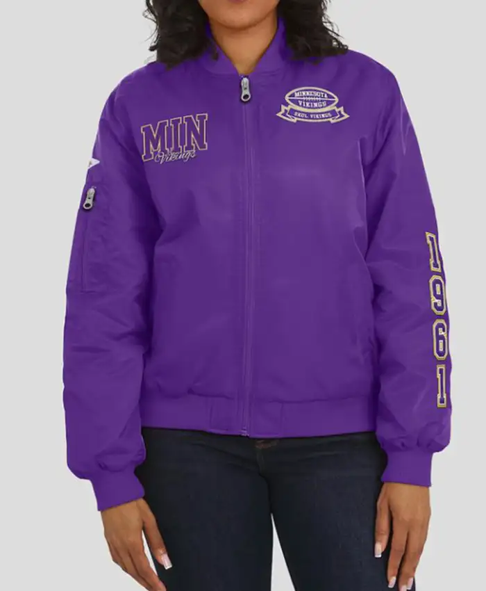 The viscose lining really brings that extra bit of comfort you didn’t even realize you were missing. Every stitch really highlights the care put into it, showcasing the Vikings’ pride and legacy. This Minnesota Vikings Patch Purple Full-Zip Bomber Jacket from Oskar Jacket is perfect for any occasion, whether you’re off to the stadium, catching up with friends, or just enjoying a drive around town. It combines style, comfort, and loyalty all in one sleek package. You’ll see, once you put it on, that game-day thrill will hit you anytime, anywhere, making even the simplest moments feel like a big deal.