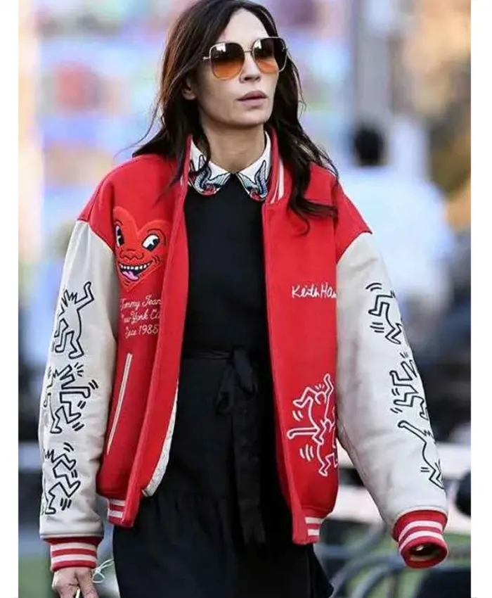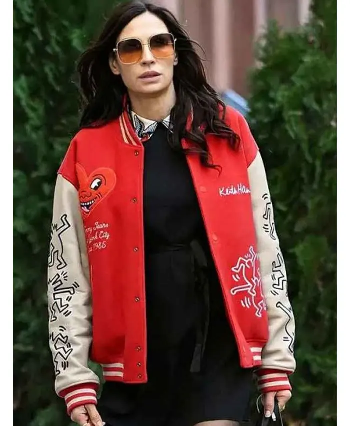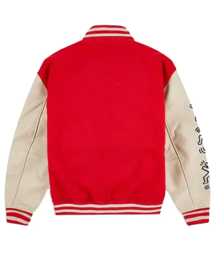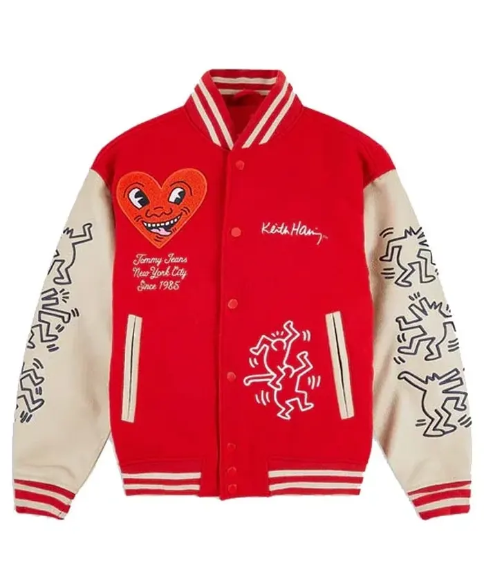 New York City 2026 Famke Janssen Keith Haring Heart Face Red and White Varsity Jacket