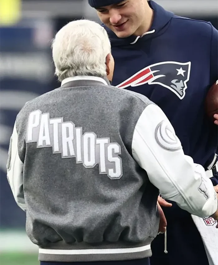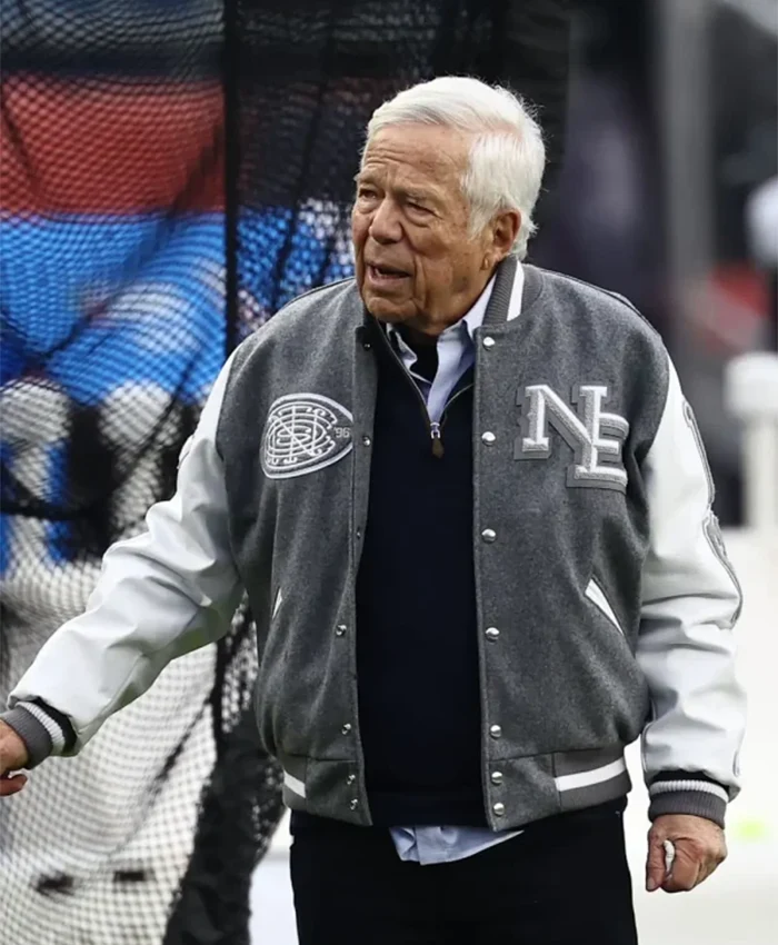Robert Kraft, a well-known American billionaire and the owner of the New England Patriots of the National Football League, recently wore a bomber jacket in white and grey. He wore the jacket for an AFC (American Football Conference) divisional playoff game against the Houston Texans that the Patriots won. As a result, the Robert Kraft AFC Divisional Playoff Patriots Bomber Jacket that Kraft wore has become an in-demand piece. Whether you are a fan of the Patriots or admire Robert Kraft, or like wearing statement bomber jackets, you will love adding the same jacket to your closet. Then, look no further than the Oskar Jacket.