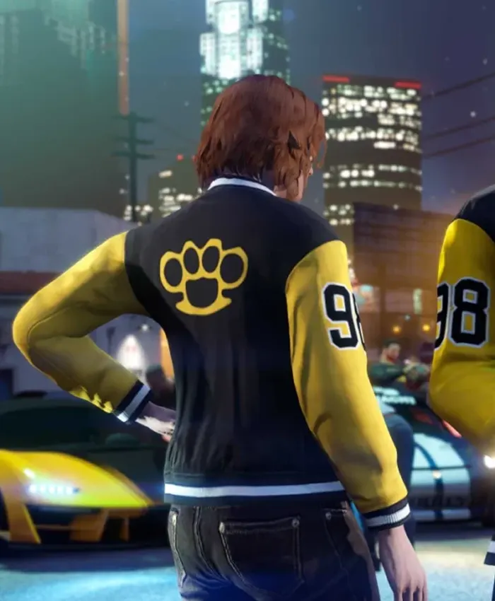 There is no doubt that the Rockstar Community GTA Series Blue and Yellow Varsity Jacket is a remarkable fashion piece. Moreover, it has touched many fans and admirers. Likewise, if we focus on the design, this jacket is crafted with wool fabric and real leather sleeves. This material allows a bold and dynamic look. Beyond that, this ensemble features a blue and yellow color theme where the rockstar logo is quite common and adds a nice touch. Additionally, this apparel features a buttoned closure that helps you swiftly cover yourself up. Likewise, at the same time, there are multiple pockets where you can keep your essential accessories. There is no doubt that among many GTA Outfits this jacket stands out. Let us now move ahead and focus on how you can style this outfit.