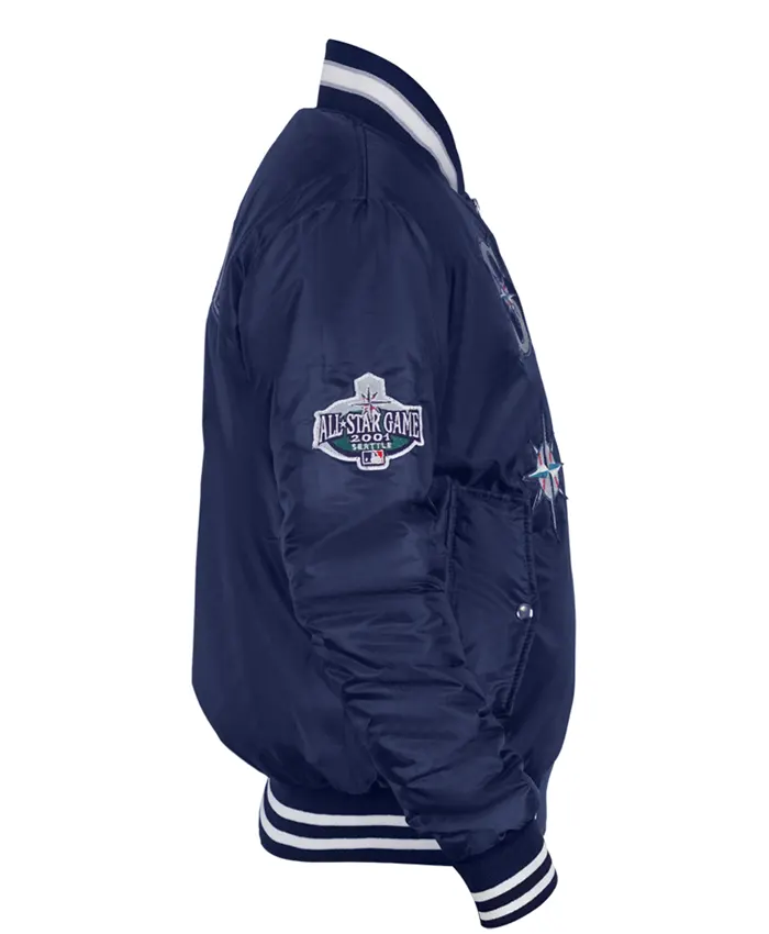 This Seattle Mariners Ma-1 bomber jacket is made of smooth satin with a soft viscose inner. It keeps you comfortable without being too big and is always ready for a casual time. The rib-knit collar and cuffs fit snugly, and the full-length sleeves and zipper closure keep you warm and make it easy to put on and take off. This jacket has two side pockets and two inside pockets that are useful for carrying things like your belongings. The dark navy blue foundation with little Mariners embellishments gives it a strong but clean design that shows team support in a modern, classy style. This jacket is a must-have for fans and a workhorse in the closet.