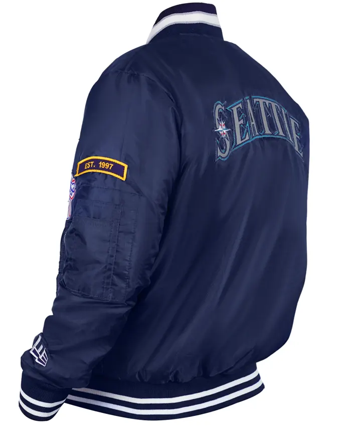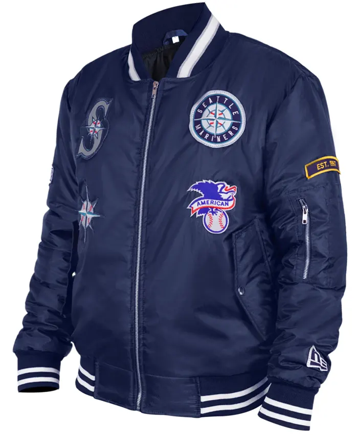 The Seattle Mariners Ma-1 Bomber Jacket is based on one of Major League Baseball’s oldest and most devoted fan clubs. Fans of baseball appreciate the Mariners because of their remarkable seasons, amazing plays, and a community that stands behind their team through every inning. The Mariners have been around since 1977. The MA-1 form comes from military flight gear and became a cultural icon decades ago because it was sturdy, fit well, and had a distinctive shape. This vintage silhouette with the proud navy blue and emblem details of the Seattle Mariners makes for a shirt that is both sporty and classic.