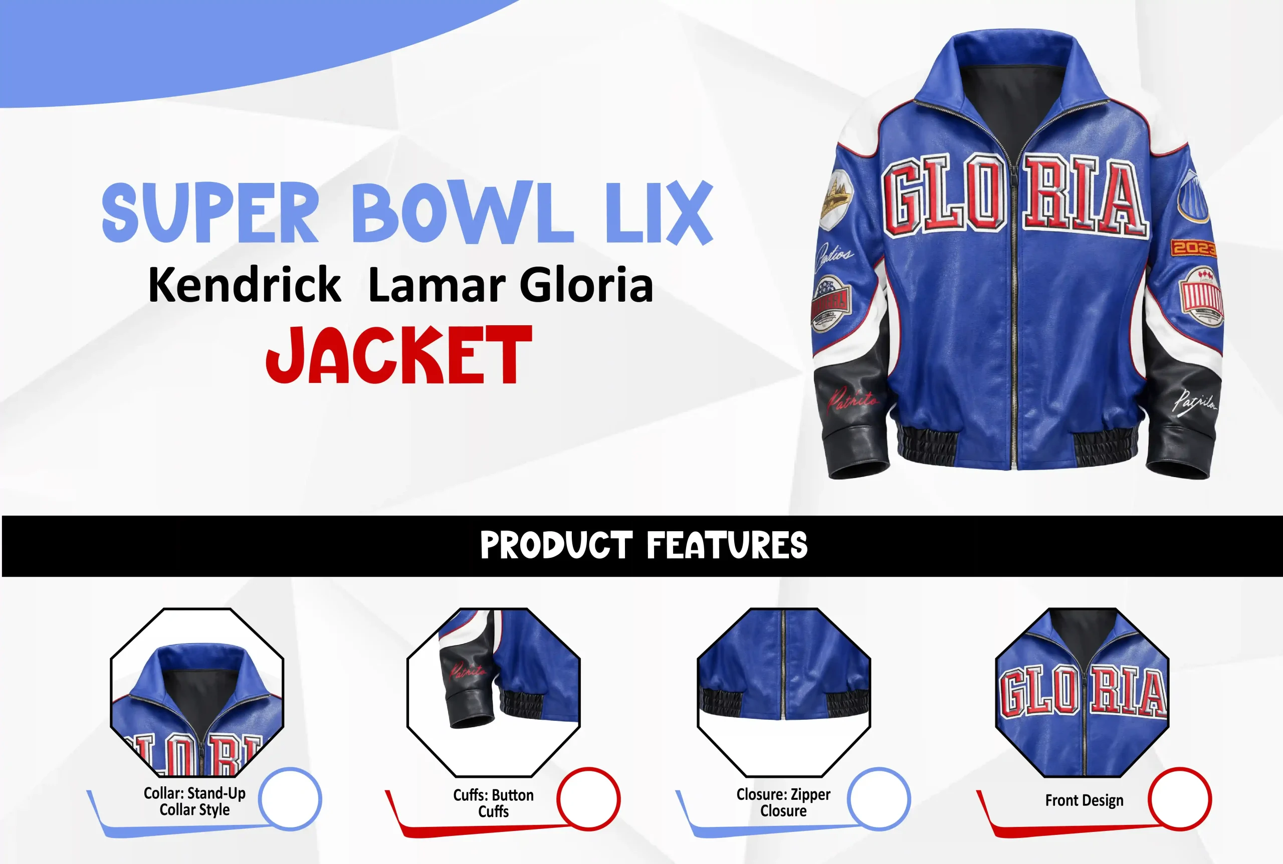 Kendrick Lamar appeared for Super Bowl LIX (59) Halftime Show in 2025, wearing a blue leather jacket with “Gloria” written on it. The Super Bowl LIX Kendrick Lamar Gloria Jacket not only inspired Lamar fans but also made them wonder why his NFL (National Football League) jacket says Gloria. The jacket mentioned earlier was a nod to Lamar’s 2024 GNX album closing track, “Gloria.” Has the same jacket inspired you, like massive Lamar fans, including males and females? If yes, you would certainly want to have this jacket in your closet? Look no further than the Oskar Jacket for the Super Bowl LIX Kendrick Lamar Gloria -Inspired jacket!
