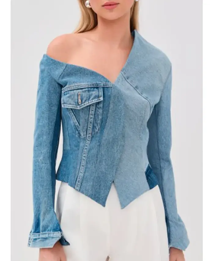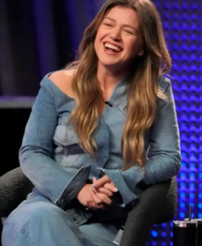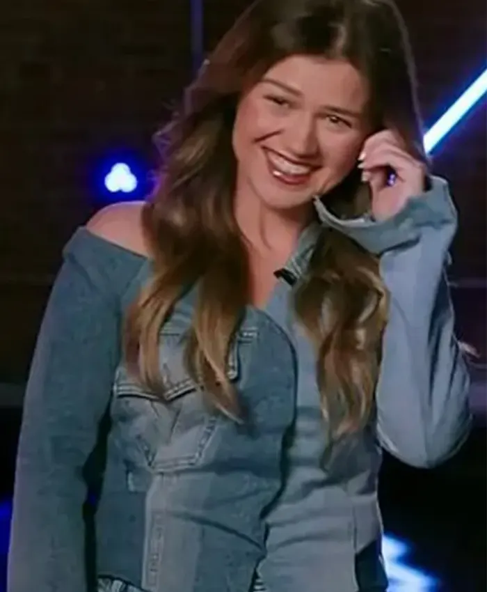Kel­ly Clark­son TV Show The Voice 2026 Asym­met­ric Blue Den­im Jack­et