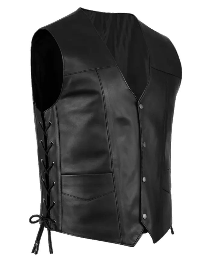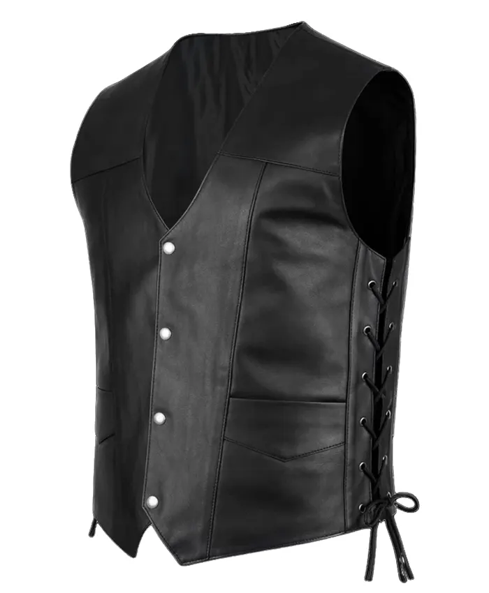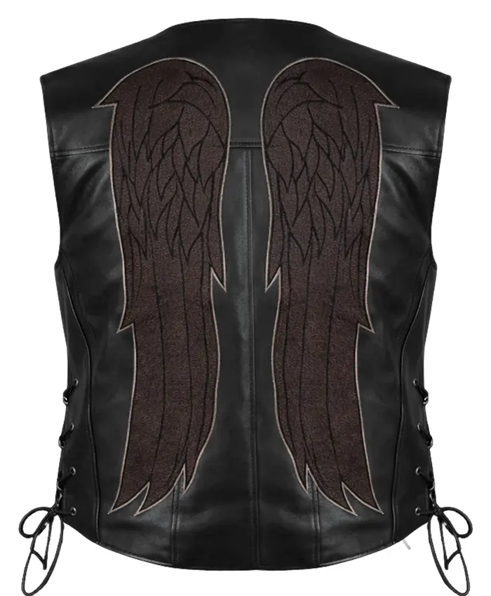 We have introduced this vest for all the fans out there. This stylish vest is fabricated with genuine leather, but you can also order it in leather. It has a black satin lining inside it for your comfort. It also features a V-neck style collar, buttoned front closure, two outside pockets, and laces on both sides for adjustment. Additionally, The Walking Dead Daryl Dixon Black Leather Vest contains a pair of silver angel wings embroidery patches at the backside of the vest. Order this vest now!