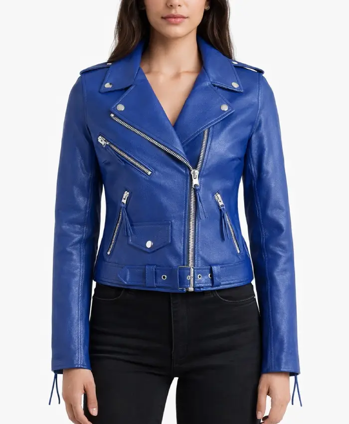 This jacket is a total confidence booster, The fit is sleek and the leather feels soft and durable. I love the blue its refreshing compared to the typical black biker jackets.