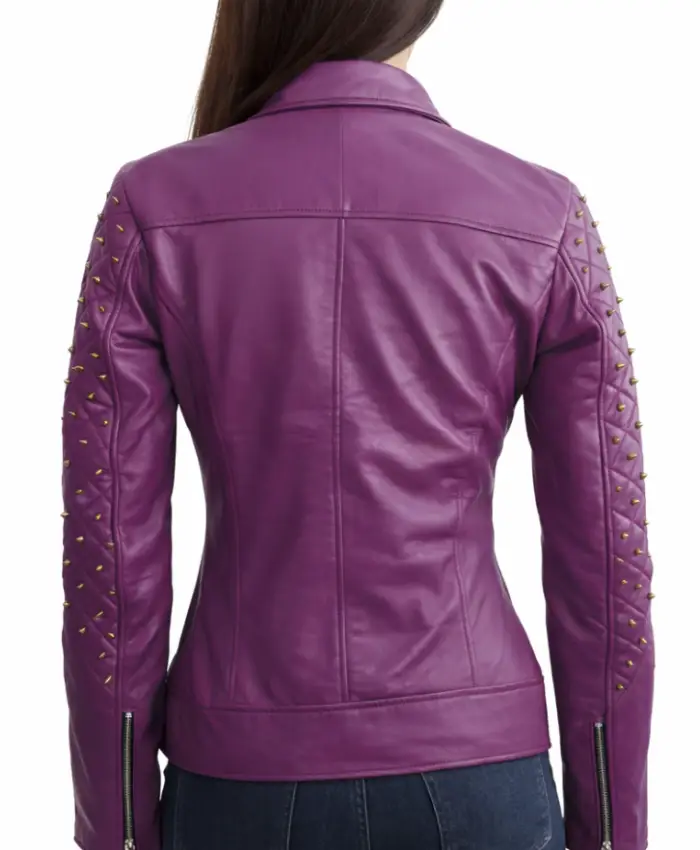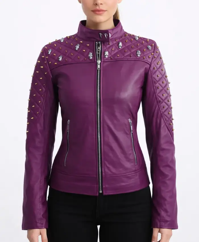 Women Purple Quilted Stud Leather Jacket