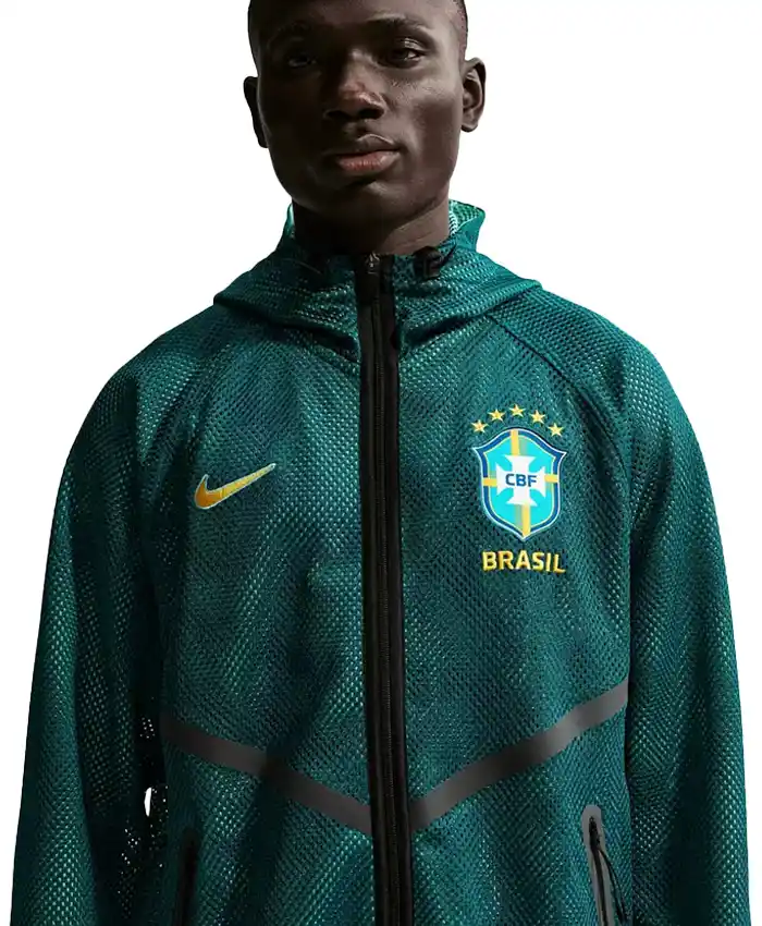 The Brazil Mesh Anthem Jacket is crafted from breathable green-mesh fabric. Well, it also keeps it light and perfect for moving freely. The soft viscose lining inside feels really smooth and gentle against your skin. And, you know, ensuring it’s comfy for those long hours. The hooded collar gives it a sporty, laid-back feel, and the zipper closure makes it super easy to adjust on the fly. Well, the full-length sleeves with rib-knitted cuffs give the jacket a secure fit. Keeping everything in place while you stay active.