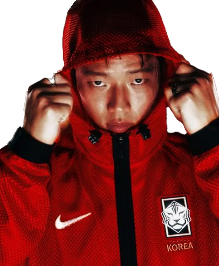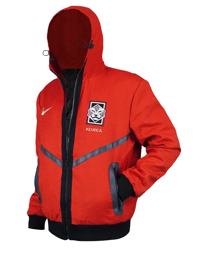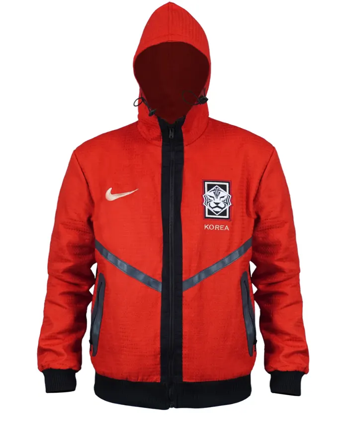 Red really grabs your eye, demands attention, and instantly boosts the energy in the room. The World Cup 2026 Korea Anthem Hooded Jacket really hits the mark, doesn’t it? From the moment you slip it on, it feels alive, bold, and ready for anything. Well, it is perfect for fans who want to show their team pride while staying comfortable. This jacket turns everyday wear into a statement. At Oskar Jacket, it’s designed to combine sporty style with practical wear. Making it an easy favorite for match days or casual outings. The Korea Anthem Hooded Jacket uses soft red-mesh fabric that feels breathable and light. This allows for unrestricted movement.